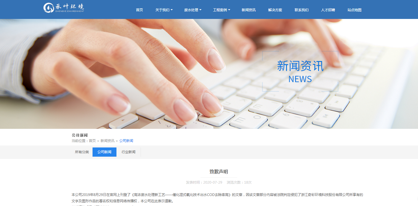 近日,我司收到來自蘇州工業園區承葉環境科技有限公司(以下簡稱“承葉環境”)的致歉聲明,承葉環境在該公司網站發布標題為“高濃廢水處理新工藝–催化濕式氧化技術 ?出水COD去除率高”的文章,該文中部分內容與我司宣傳冊中的內容構成實質性相似,且發布的基本流程圖與我司的圖形一致,侵害了我司相應文字作品的信息網絡傳播權和署名權。