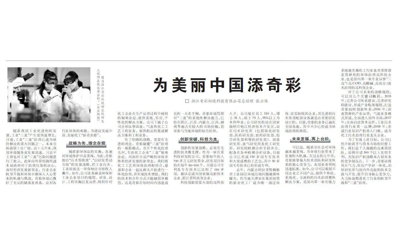 可以說,隨著全社會對環保越來越重視,為環保行業帶來了發展的大機遇。在過去的幾年里,奇彩依靠強大技術團隊和研發體系的核心競爭力,各項業務得到迅速拓展。如今,公司可以根據不同企業之不同產品,提供個性化、系統化、全流程的污水治理整體解決方案,是國內第一家有能力系統地實施化工行業廢水零排放及資源化的環保治理高科技企業,也是國內第一家專業從事“三高”(高COD、高酸堿、高鹽分)廢水治理的高科技企業。